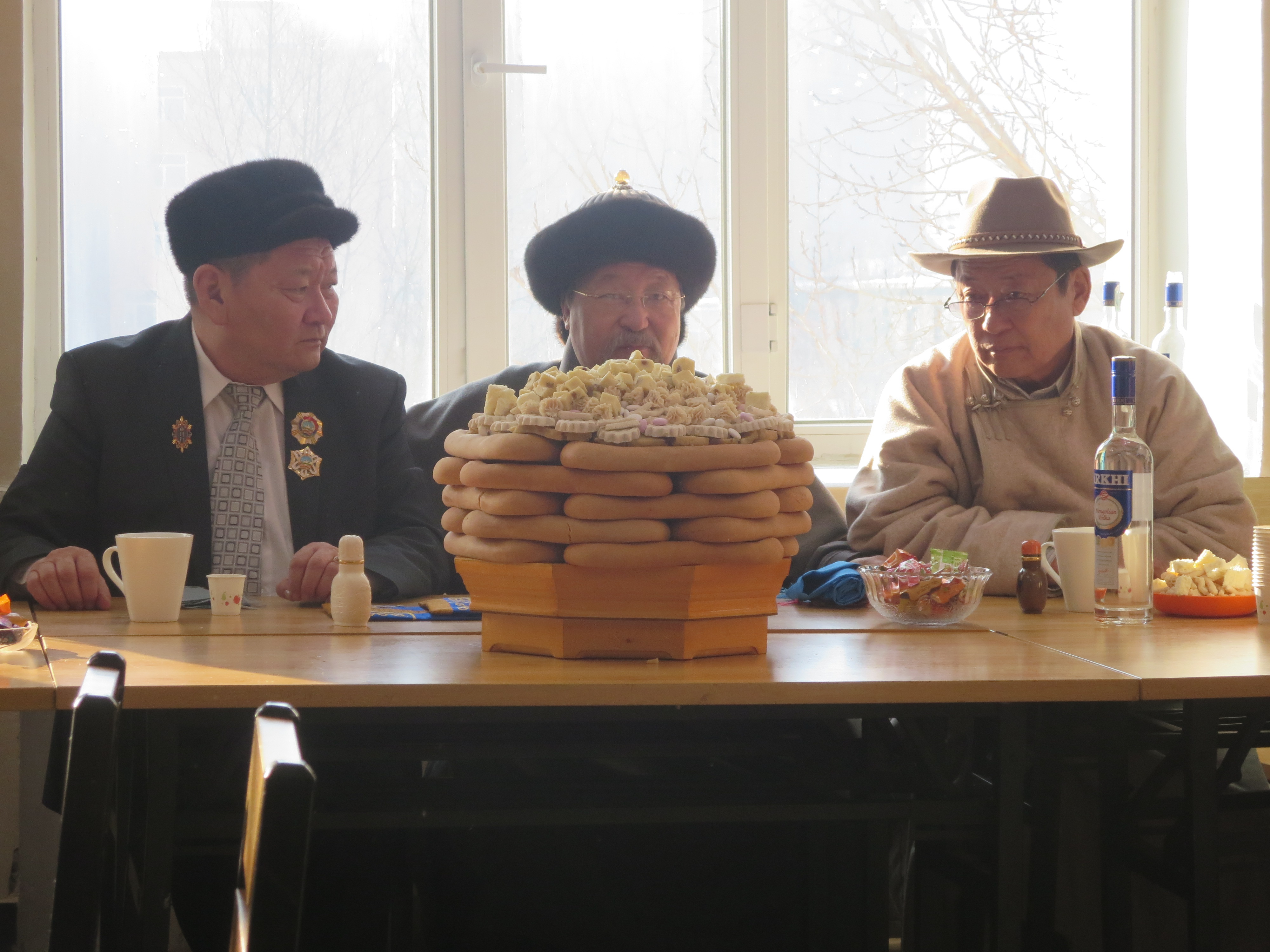 While Tsagaan Sar is officially only three days (up from two days last year) the first day back to work generally consists of Tsagaan Sar festivities. Here school officials await the Tsagaan Sar Greeting Ceremony with a tower of biscuits and “airal,” dried cheese curd, in front of them.