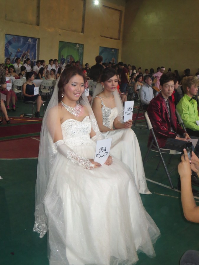 Bridal makeup and hair models sit with numbered cards, posing for photos and judges.