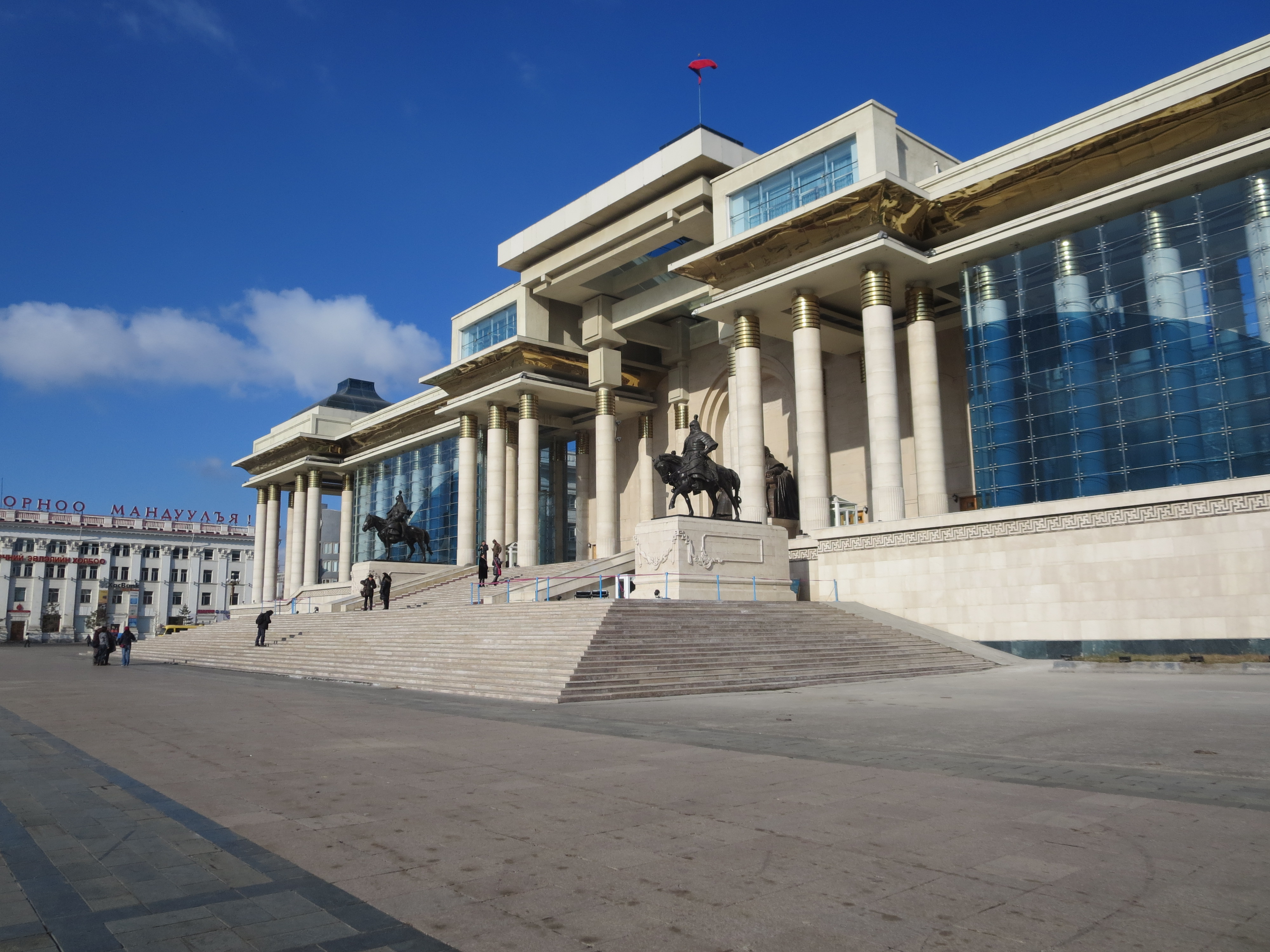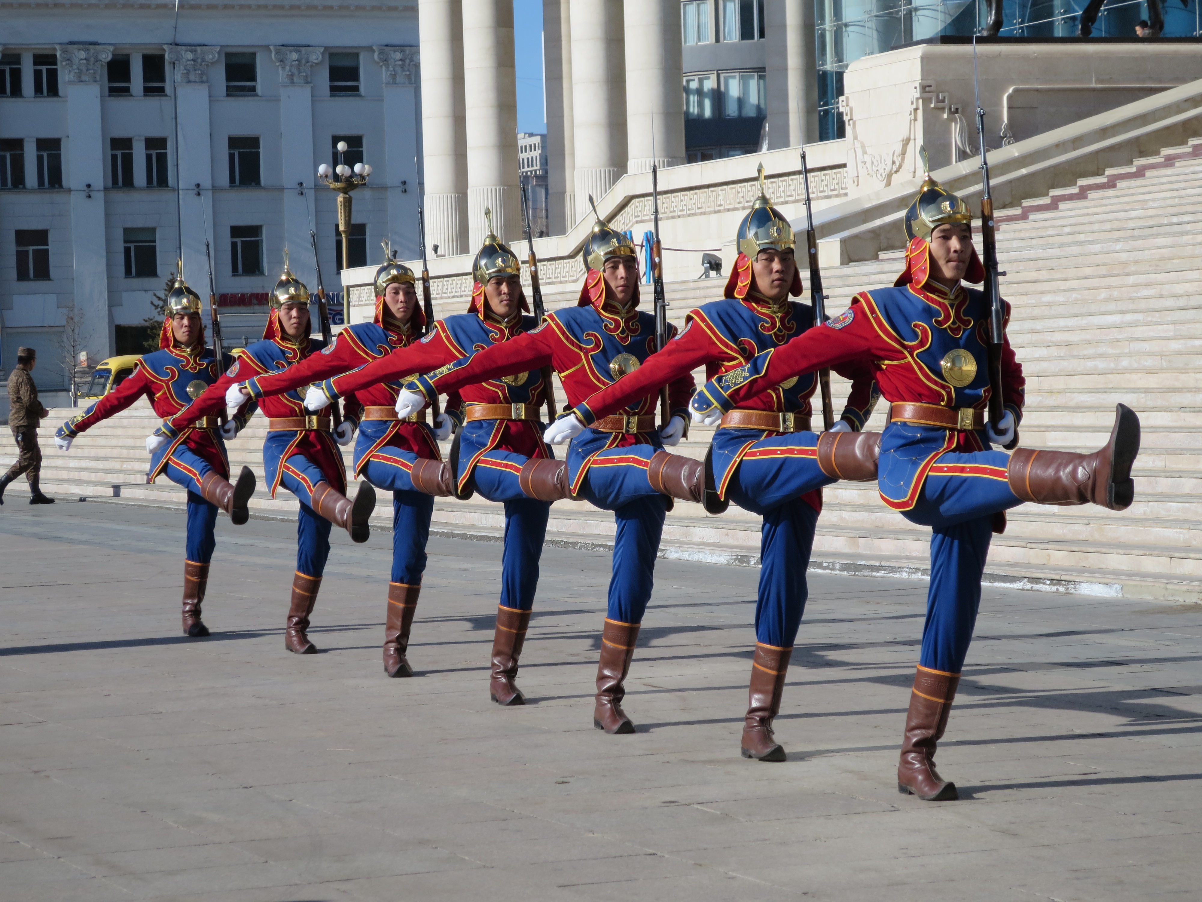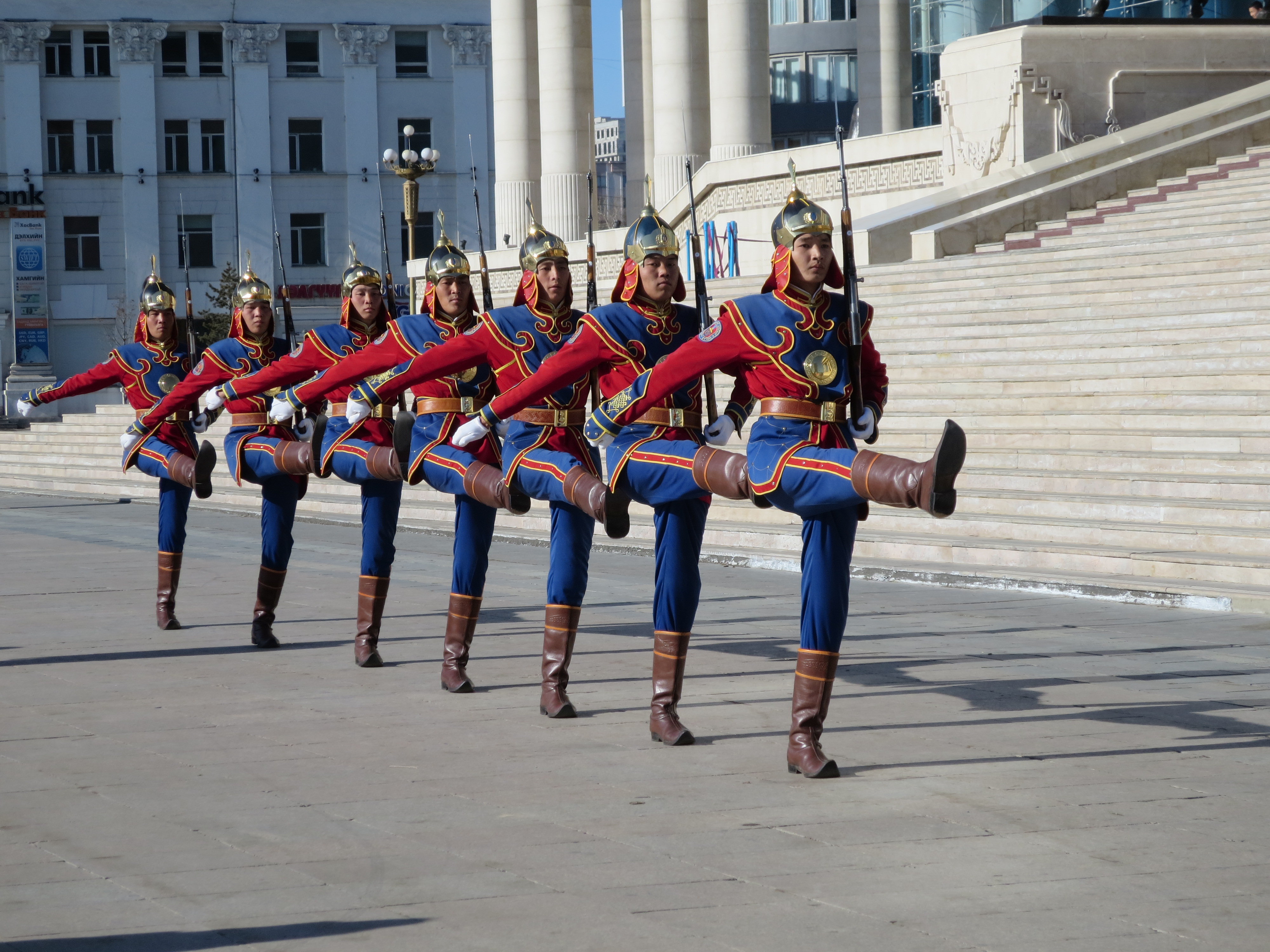 After departing the museum we walked out onto the front steps of Parliament right into a massive display of pomp and circumstance. Dozens of Mongolian soldiers marched up the steps in perfect synchronization (very un-Mongolian) as we scrambled down them. We were quickly ushered off the “stage” by security officers, but we still had an excellent view of the elaborate ceremony. Later I learned it was a practice run for Genghis Khan’s birthday (Chingghis Khan to Mongolians). It was nice to not have to compete with the crowds for these photos. There were maybe two dozen people on hand to witness the rehearsal.