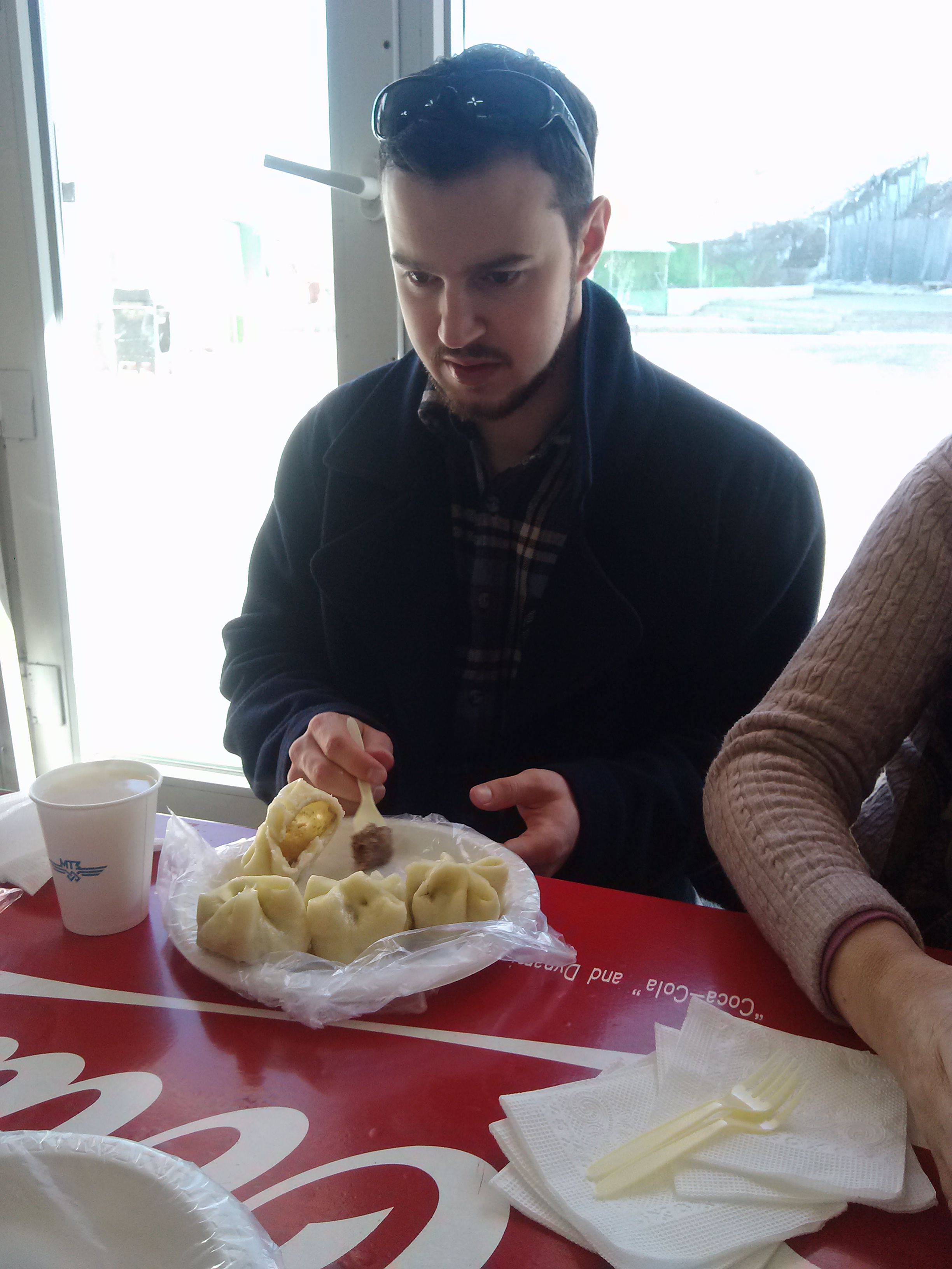 After the marching and more photos, we took a bus across town. Thankfully, our first stop was for lunch at a small restaurant that sold two things, buuz and milk tea. What more does a Mongolian need?