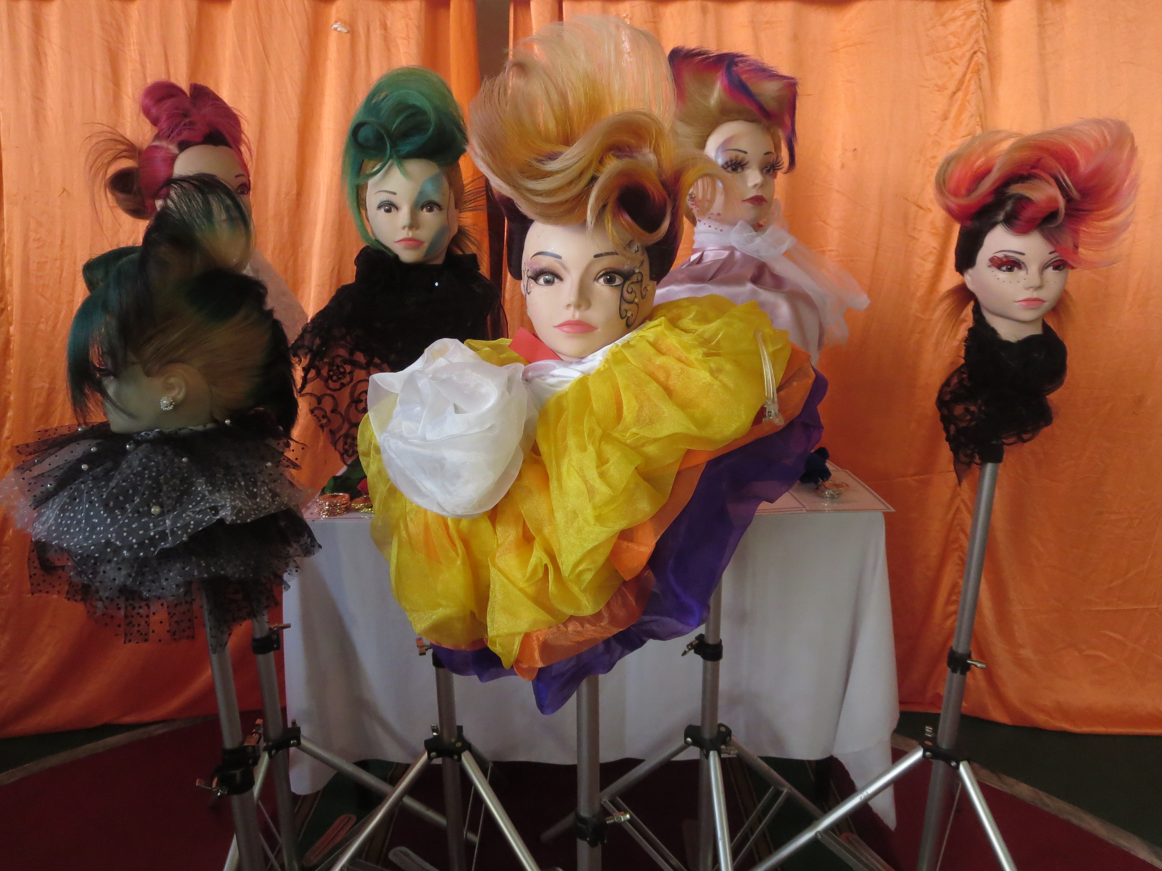 Contestants’ work is on display! Each model holds a card with a number corresponding to their beautician.